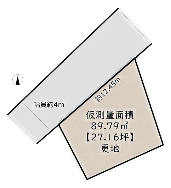 一方 北西 間口12.45m 私道 幅4m 位置指定有 |