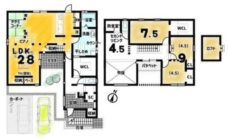 | 設備 | ウォークインクローゼット、駐車2台可、ロフト、浴室に窓、トイレ2箇所、テラス、吹抜、防音室、EVコンセント付 | ||