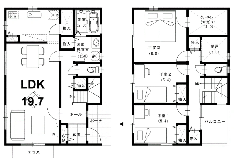 1F:55.48㎡ 2F:52.99㎡ ※テラス費用別途要