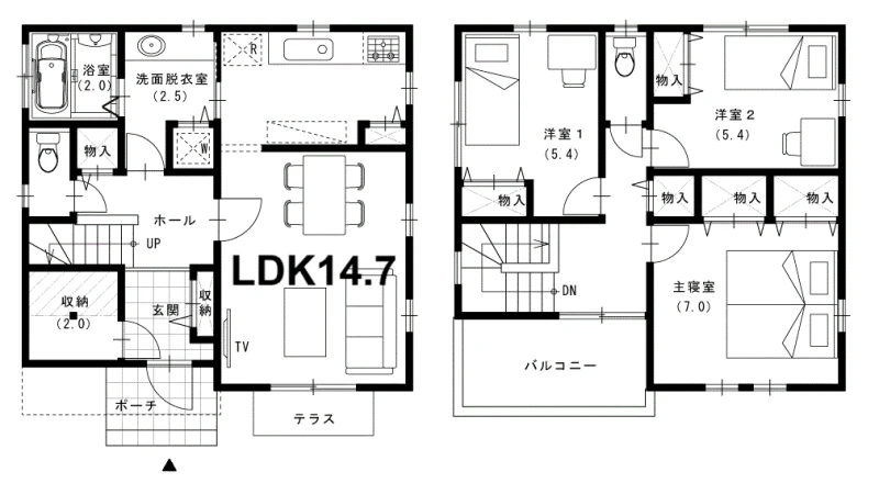延床面積:92.73㎡(28.05坪) 1F:48.02㎡ 2F:44.71㎡