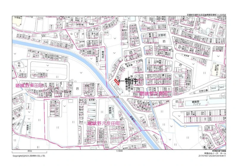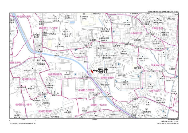 ※地図上の「対象地」は「京都府京都市右京区嵯峨野芝野町 」付近を示しています。実際の場所ではない場合がございます。詳しくはお問い合わせください。