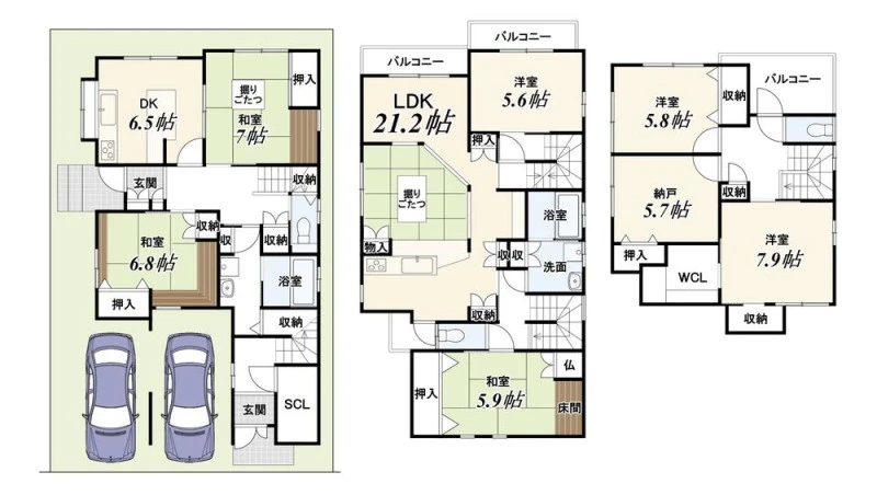 | 設備 | 3面バルコニー、南面バルコニー、ウォークインクローゼット、シューズインクローゼット、掘ごたつ、トイレ3か所 | ||