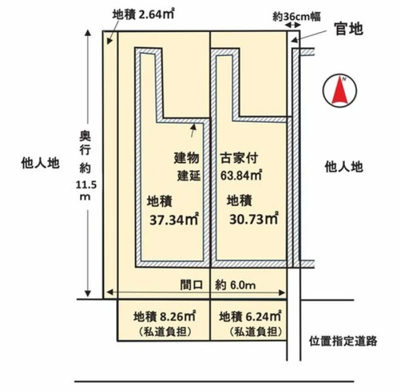一方 南 間口6m 私道 幅4.8m 位置指定有 |