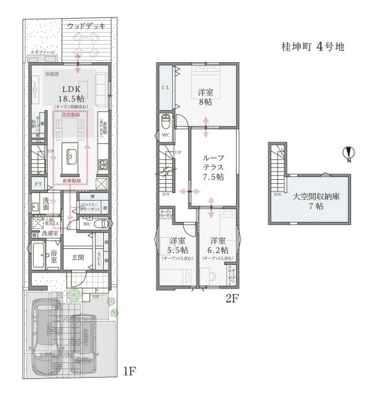 | 設備 | トイレ2箇所、上水道、下水道、都市ガス、床暖房、シューズインクローゼット、ウッドデッキ、パントリー、乾太くん、ファミリーCL | ||