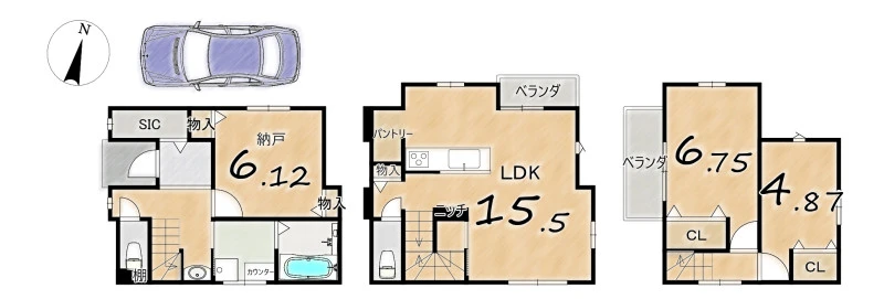 | 設備 | カウンターキッチン、トイレ2箇所、上水道、下水道、都市ガス、パントリー、SIC | ||